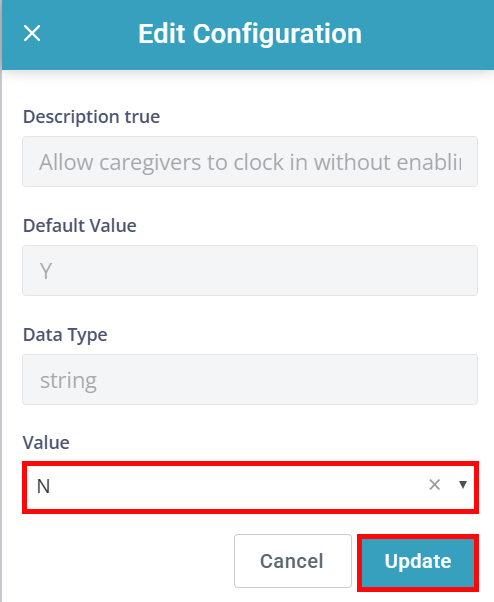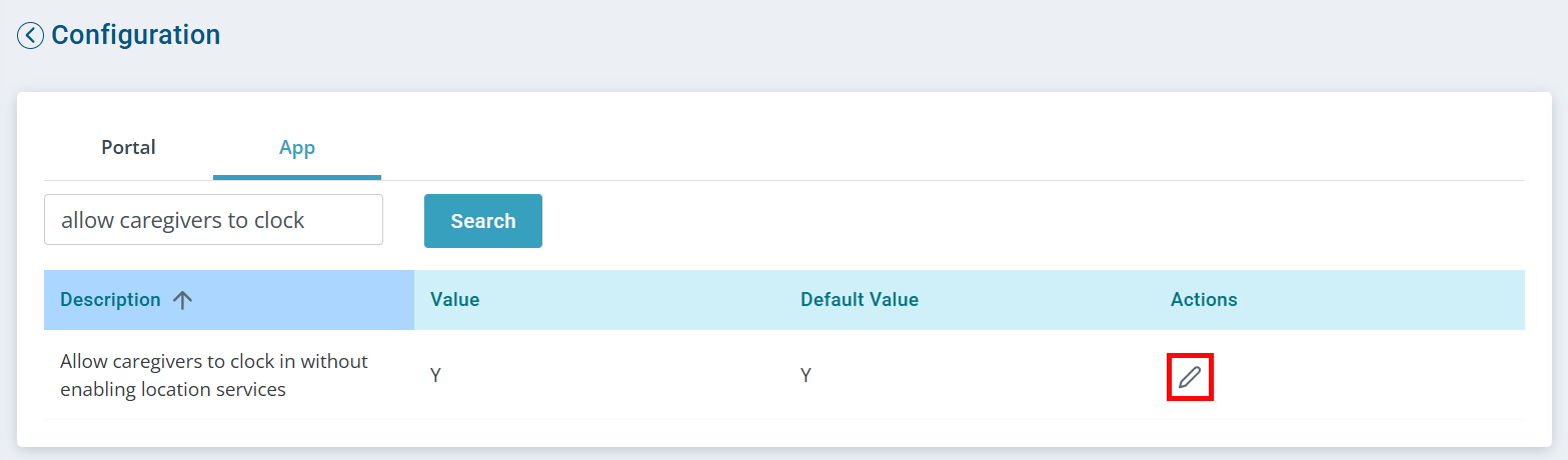 Search for allow caregivers to clock. The Allow caregivers to clock in without enabling location services configuration appears.