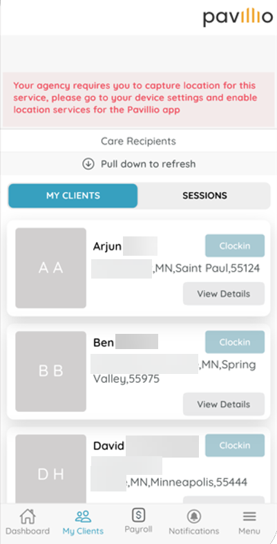 The app displays the following and disables the clock in buttons for all Clients until location services are enabled: