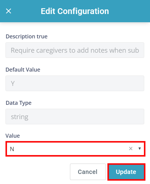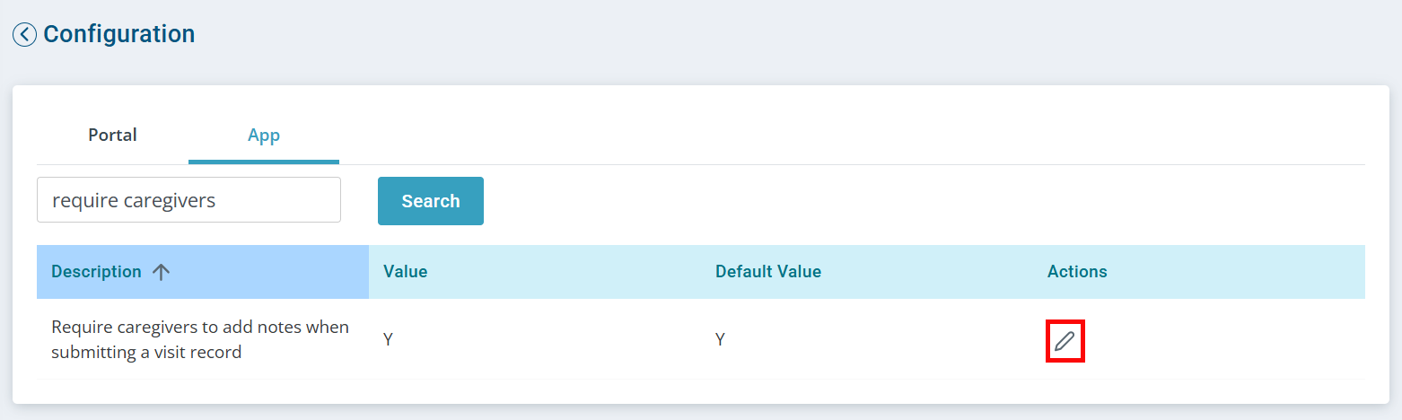 Search for require caregivers. The Require caregivers to add notes when submitting a visit record configuration appears.
