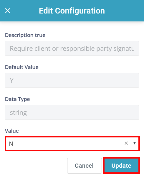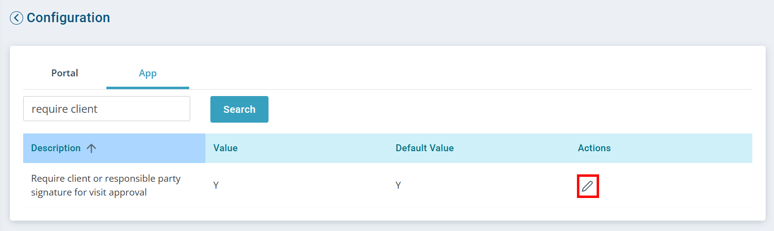 Search for require client. The Require client or responsible party signature for visit approval configuration appears.