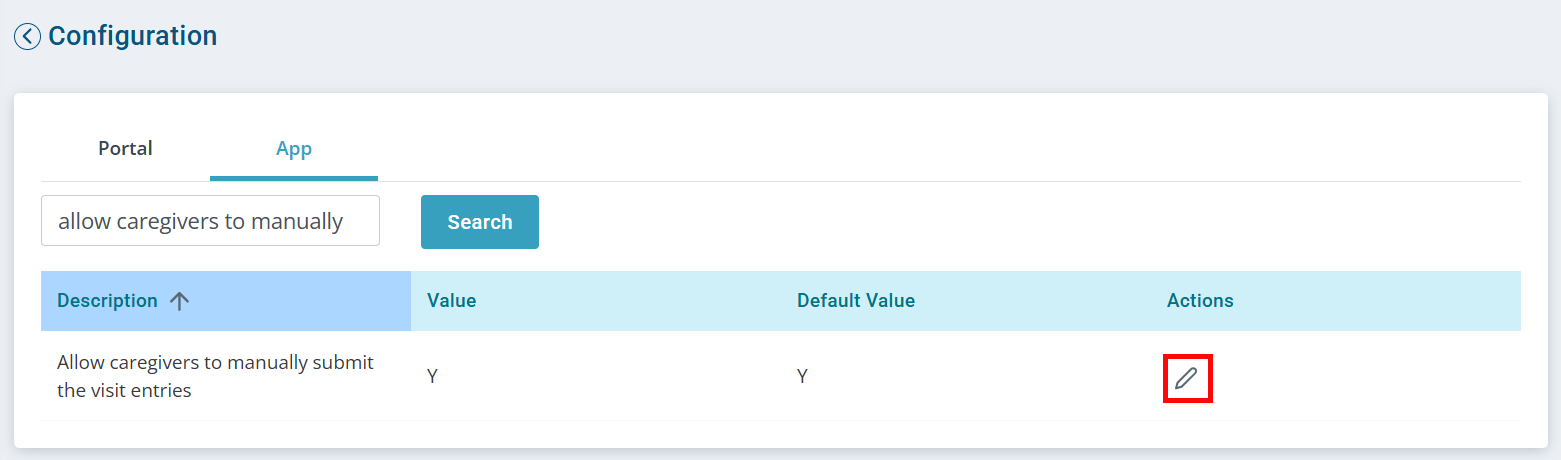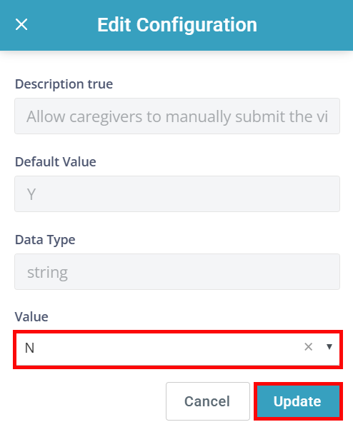 Search for allow caregivers to manually. The Allow caregivers to manually submit the visit entries configuration appears.