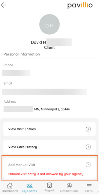 By default, Caregivers can manually create and submit timesheets by going to View Details > Add Manual Visit. You can block this option by adjusting the following settings: