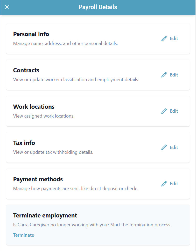 In the side panel that opens, you can view and edit the Employee's Contracts, Work Locations, Tax Info, Payment Methods, Pay Types, and Time Off. You can also terminate an Employee from this section.