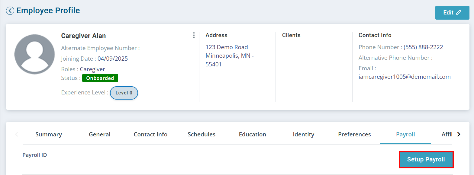 To change an Employee's pay rate, click into the Employee's Profile and select the Payroll tab. Click the Edit button on the upper right.