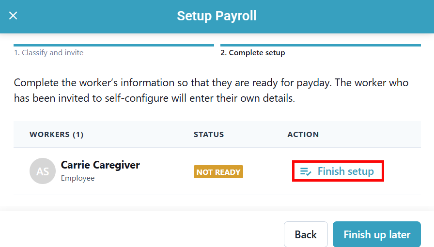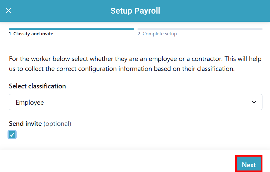 The Setup Payroll panel opens. Select whether the Employee is an Employee or a Contractor using the dropdown.