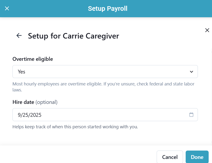 If the Employee has been sent an invite to fill out their information, select whether or not they are Overtime eligible, and select their Hire date (optional).
