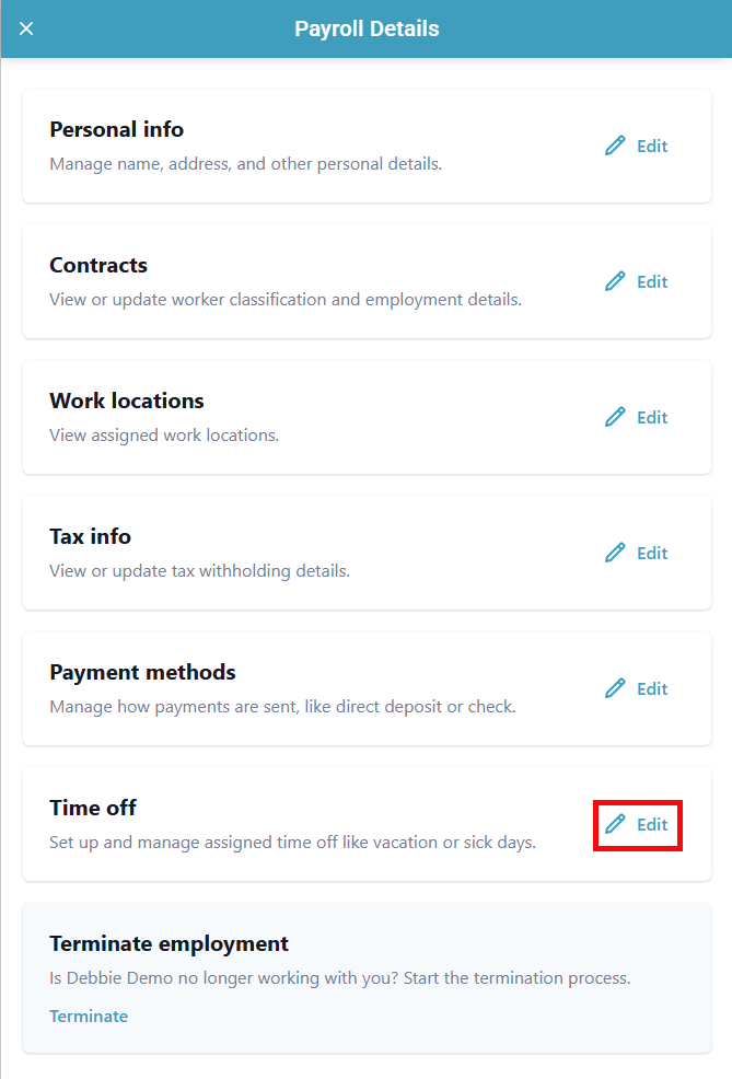 Time off is a period of time where workers are not working. Employers offer time off as a type of perk that allows workers to take a break from work to travel, rest, take care of personal tasks, etc. Employers can offer a combination of paid or unpaid time off and set different policies/rules for different groups of workers. Common examples of time off are Vacation, Sick, Holiday, and Bereavement. Employers determine time off policies for their business and can add multiple policies to their payroll account.