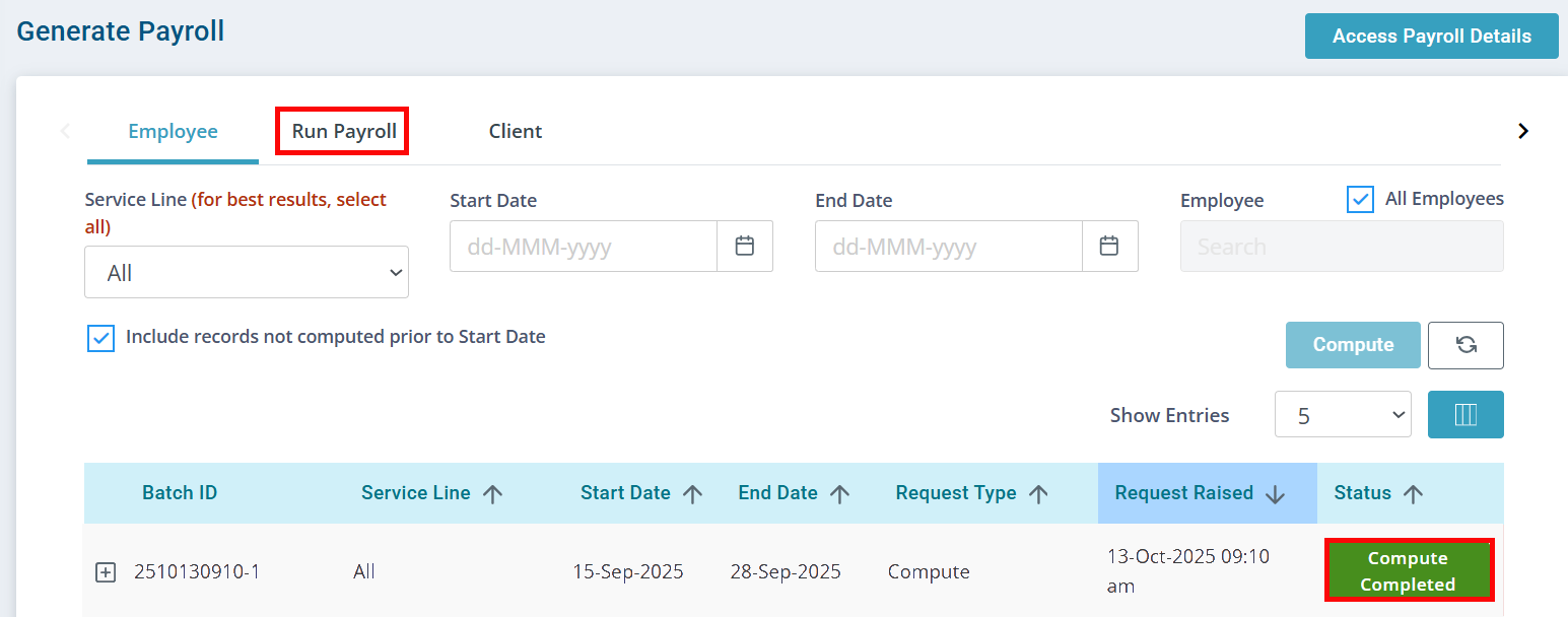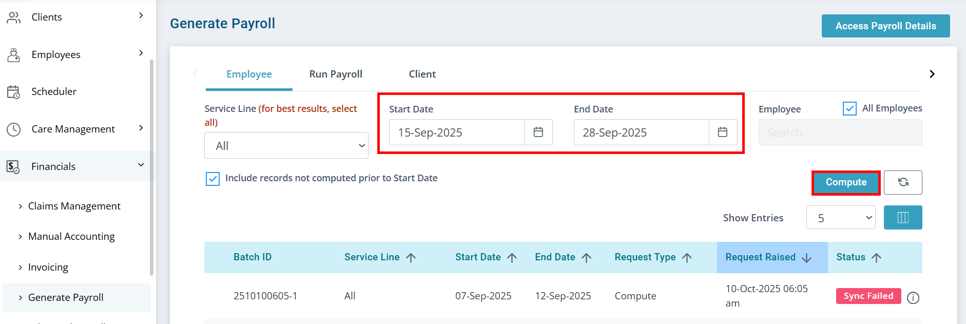 Go to Financials > Generate Payroll > Employee. Select the Start Date and End Date for your payroll, and then click the Compute button.