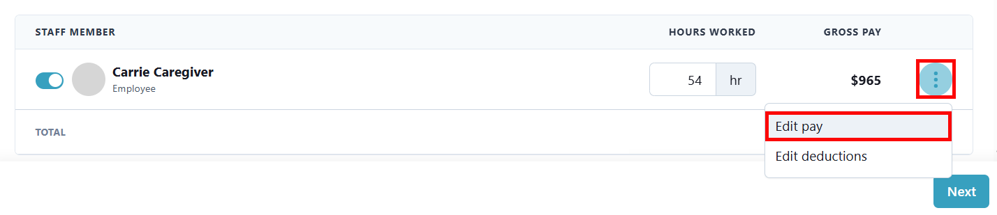 Select the Ellipsis to the right of an Employee's Gross Pay and select Edit pay.