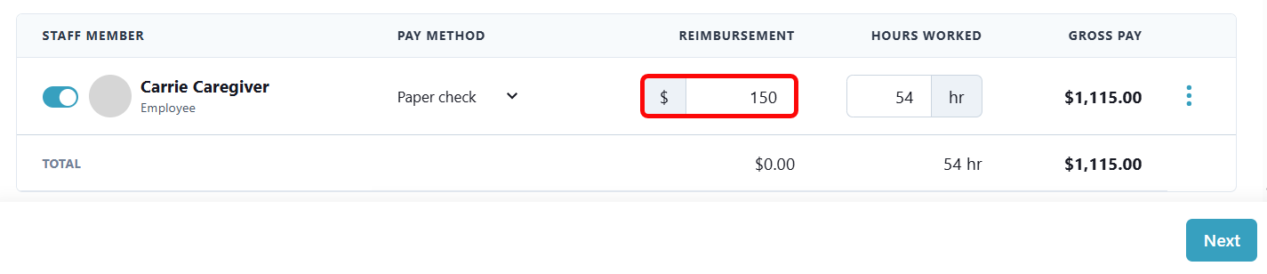 During each payroll run, remember to manually enter any mileage, in-service, and other expense reimbursements. These items are not automatically included, so you need to add them for each applicable worker before finalizing payroll.