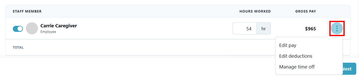 Select the Ellipsis to the right of an Employee's Gross Pay to make adjustments to the Employee's pay (such as adding a reimbursement or bonus), adjust deductions, or Manage time off.