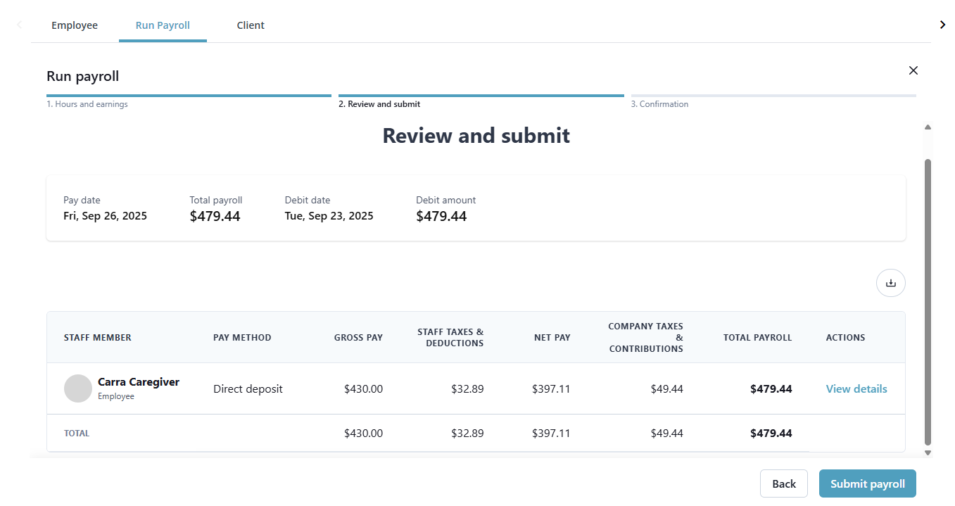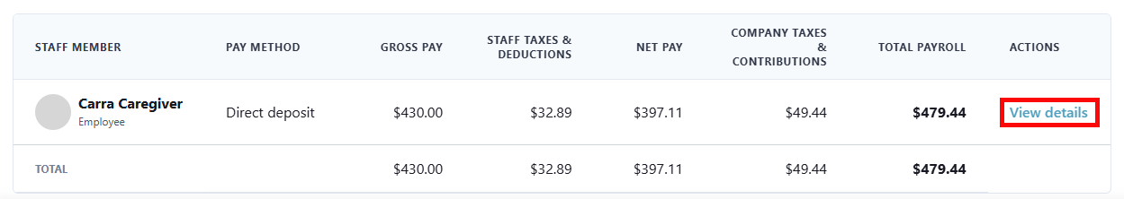 Click on View details under the Actions column to view the pay stub for the Employee.