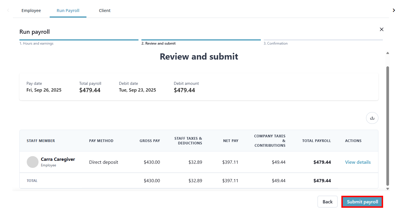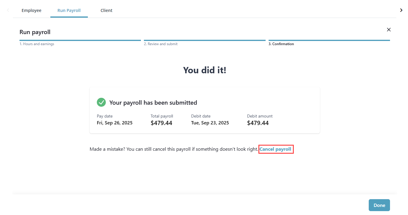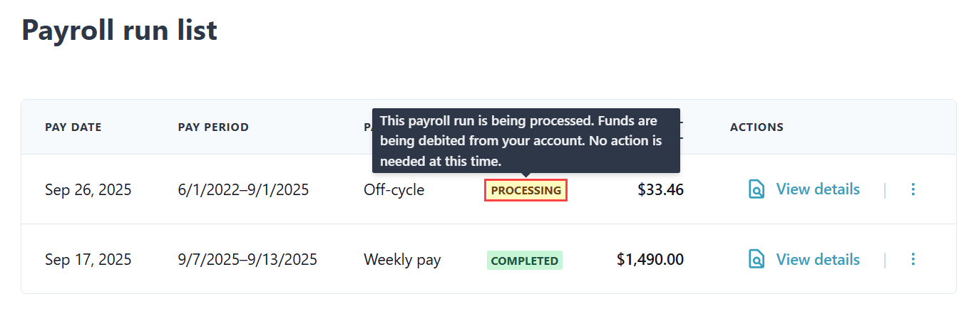 Once you have submitted payroll, it appears in the Payroll Run List at the bottom of the Run Payroll page.
