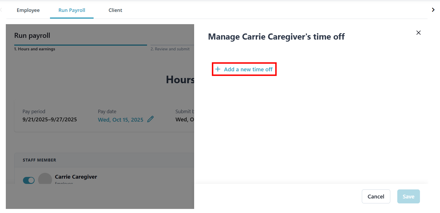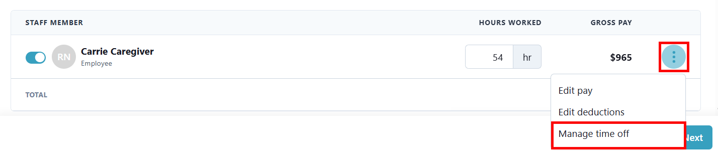 Select the Ellipsis to the right of an Employee's Gross Pay and select Manage time off.