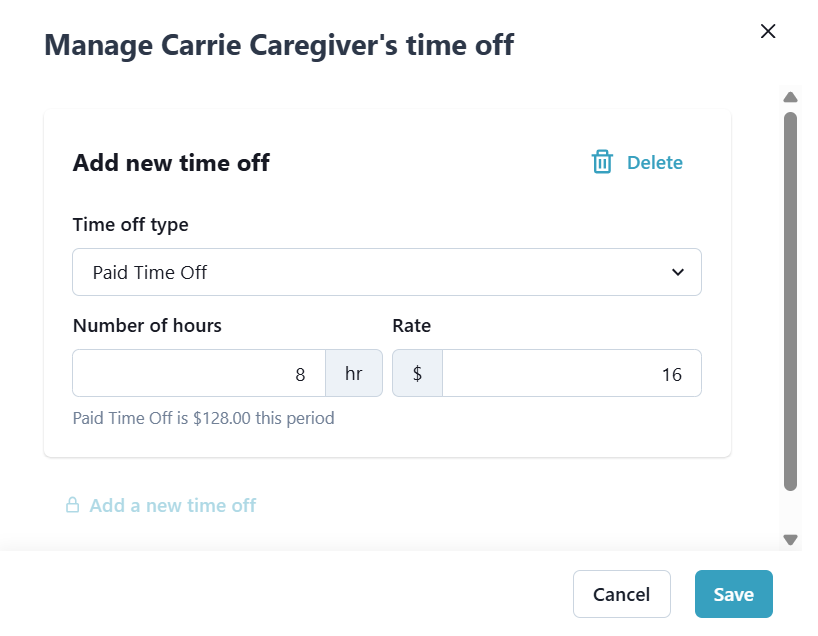 If you are adding Paid Time Off, enter or modify the Rate for calculating the pay for the time off. We compute the rate based on the Employee's salary/hourly pay, but you can override it if needed.