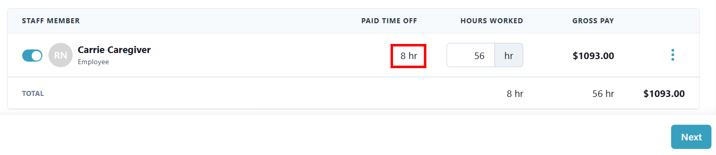 The Paid Time Off now appears in the Employee's row of the staff table.