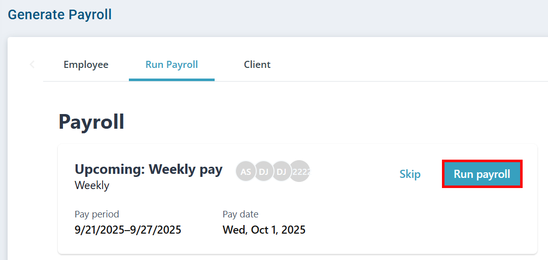 On the Run Payroll page, click the Run payroll button on the Upcoming: Weekly pay card.