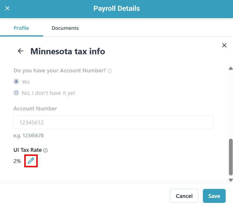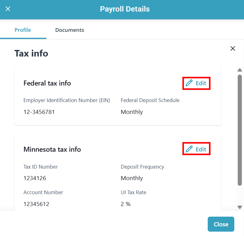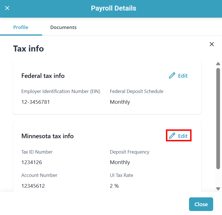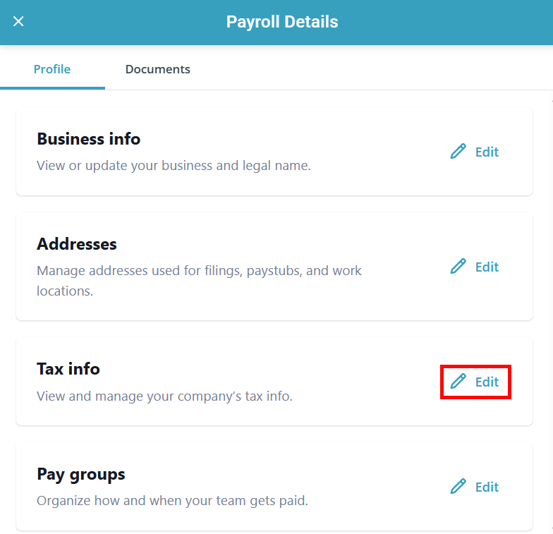 The Payroll Details panel opens. Find the Tax info section and click the Edit button.