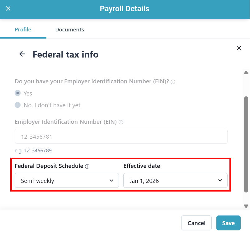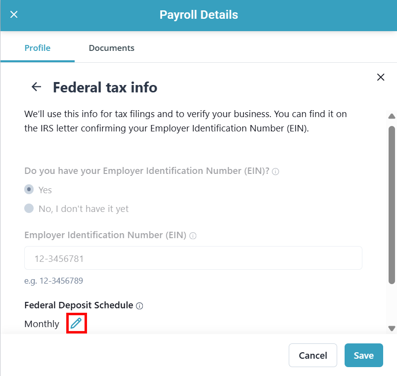 Scroll down and select the pencil icon next to Federal Deposit Schedule or Deposit Frequency.