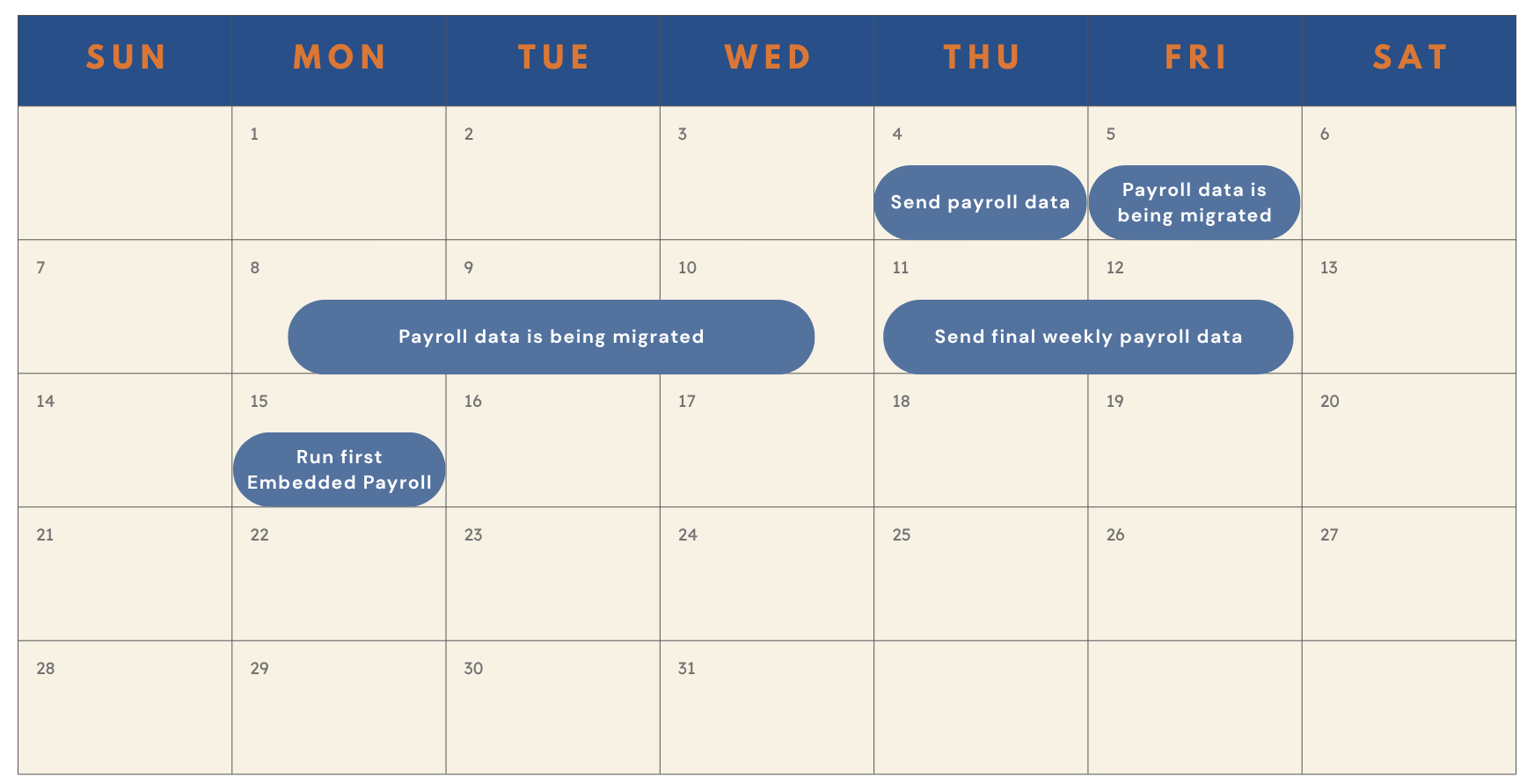 Let’s say you run payroll every Monday for a Friday check date. Send us all payroll information except for the current week’s payroll so we can start the migration process. After you run your final payroll, send us the payroll journal by Friday. This allows us to finish migrating your data so you’re ready to run your first payroll the following week.