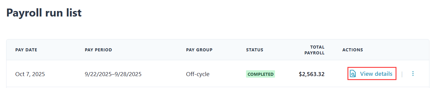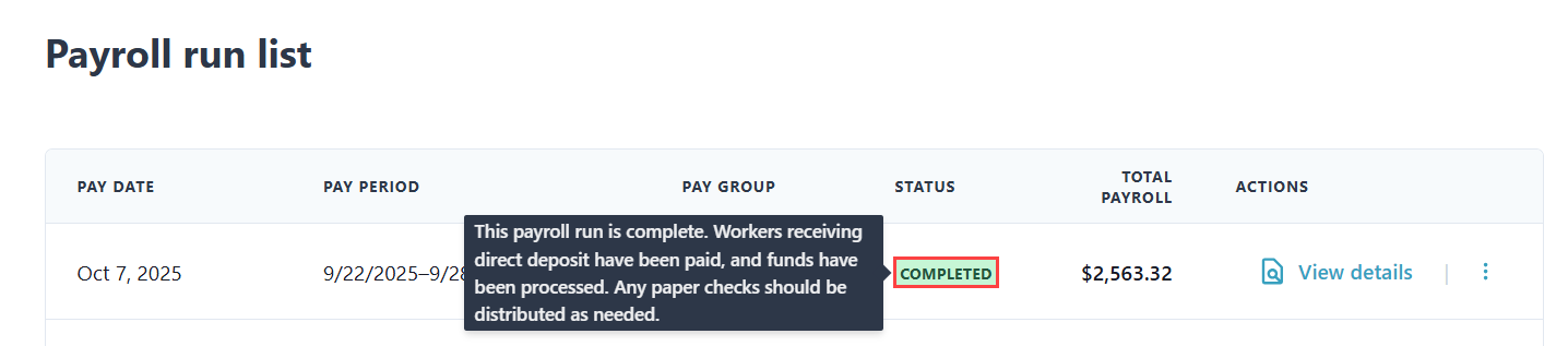 | COMPLETED | This payroll run is complete. Workers receiving direct deposit have been paid, and funds have been processes. Any paper checks should be distributed as needed. | |||