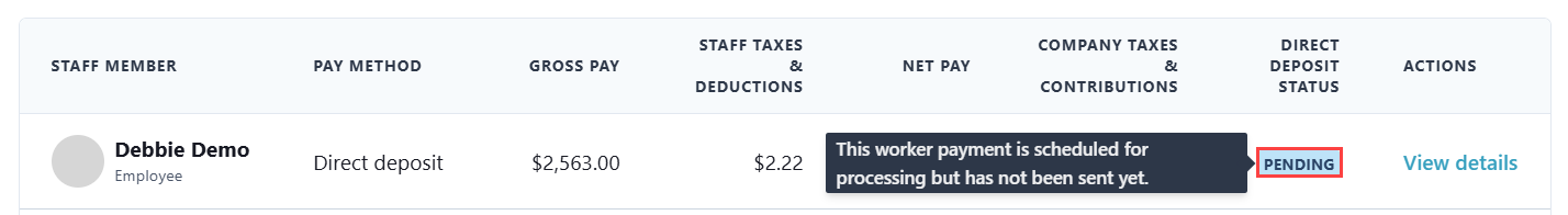 To view a worker's Direct Deposit Status, click View details under the Actions column.