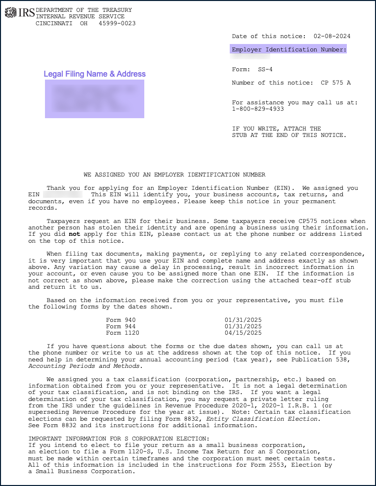 The most commonly used verification document is the CP-575. A CP-575 is an IRS notice that confirms the business has been issued a FEIN. The notice includes important tax information about the business including:
