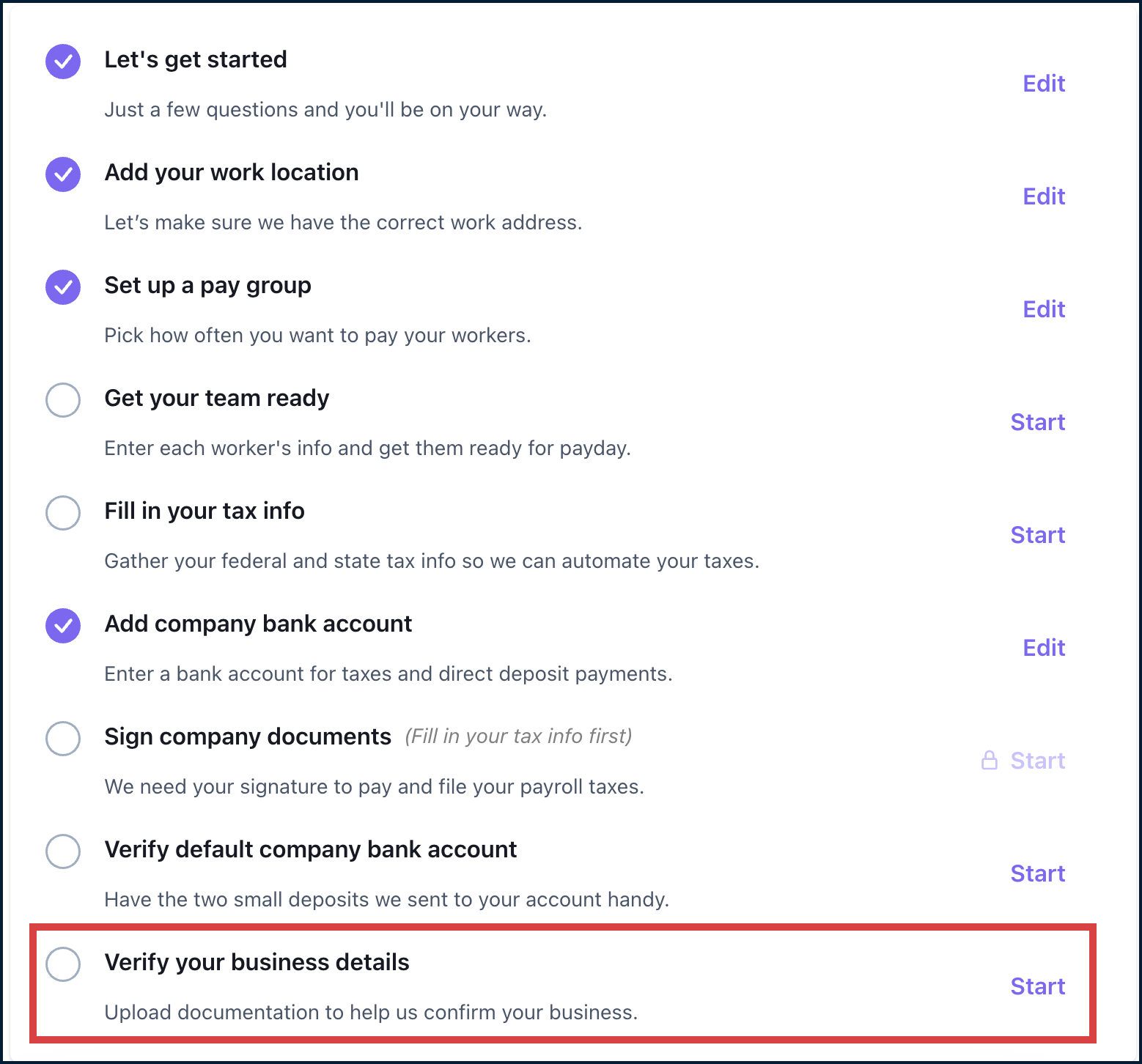 When an RFI is required during Onboarding, an additional step called Verify your business details populates in the onboarding page. Select Start to upload the RFI document.