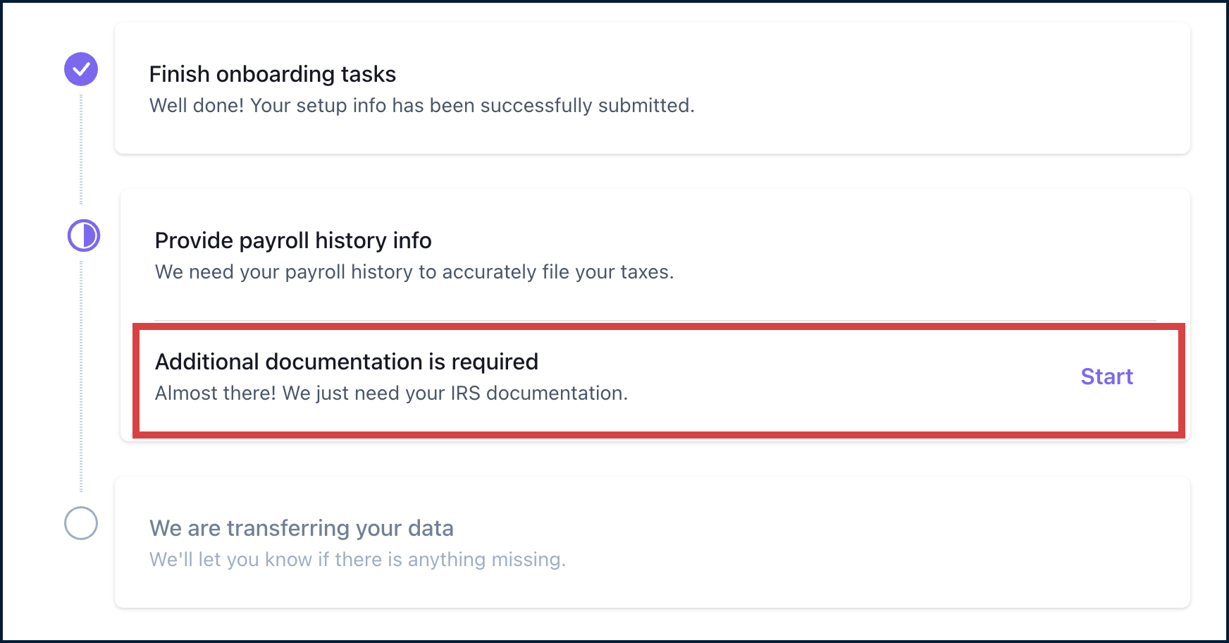 When an RFI is required after Onboarding is completed, the required document can be uploaded by navigating to the Dashboard then selecting Start next to Additional documentation is required.