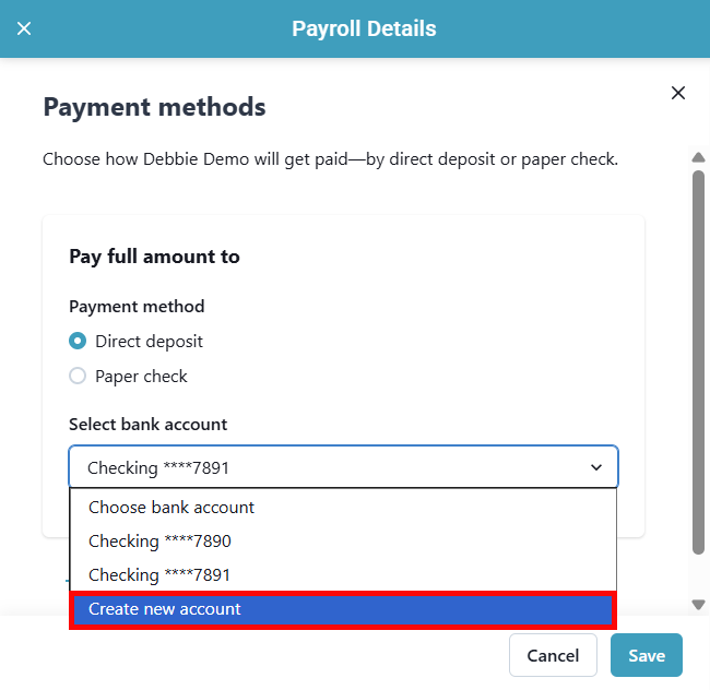 4. Make sure you have selected Direct deposit and have at least 2 bank accounts on file. You can add another bank account by clicking the Select bank account dropdown and selecting Create new account.