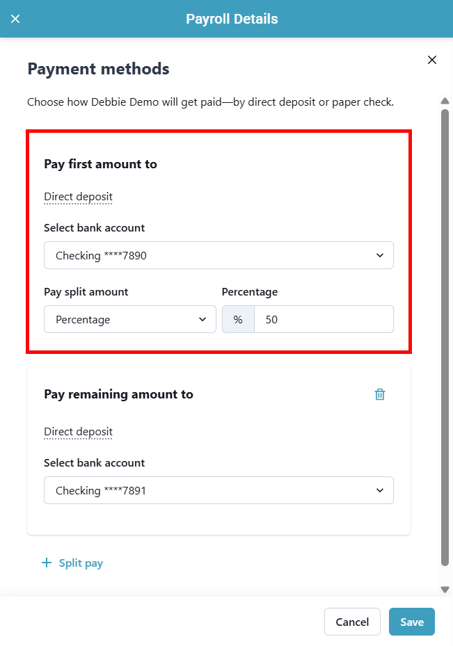 7. Optional: You can split a direct deposit between up to 3 bank accounts. To add a third bank account, click + Split pay again and enter the next Fixed amount or Percentage. The account listed last will receive the remainder (if applicable).