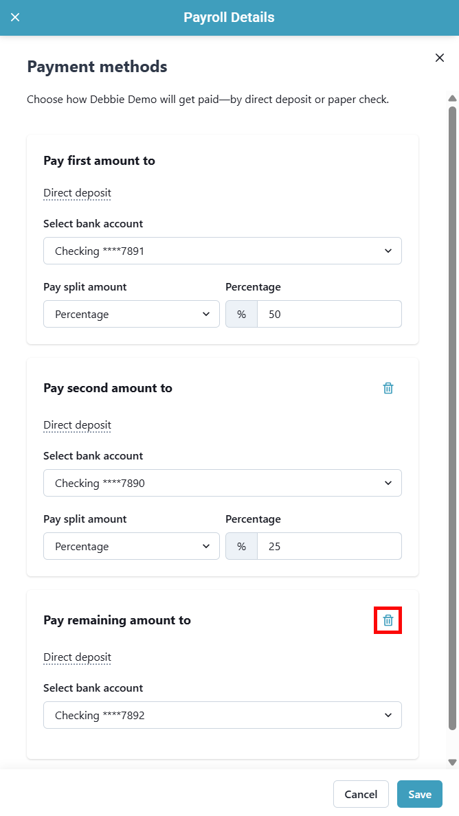 To remove a bank account from the split, click the trash can icon.
