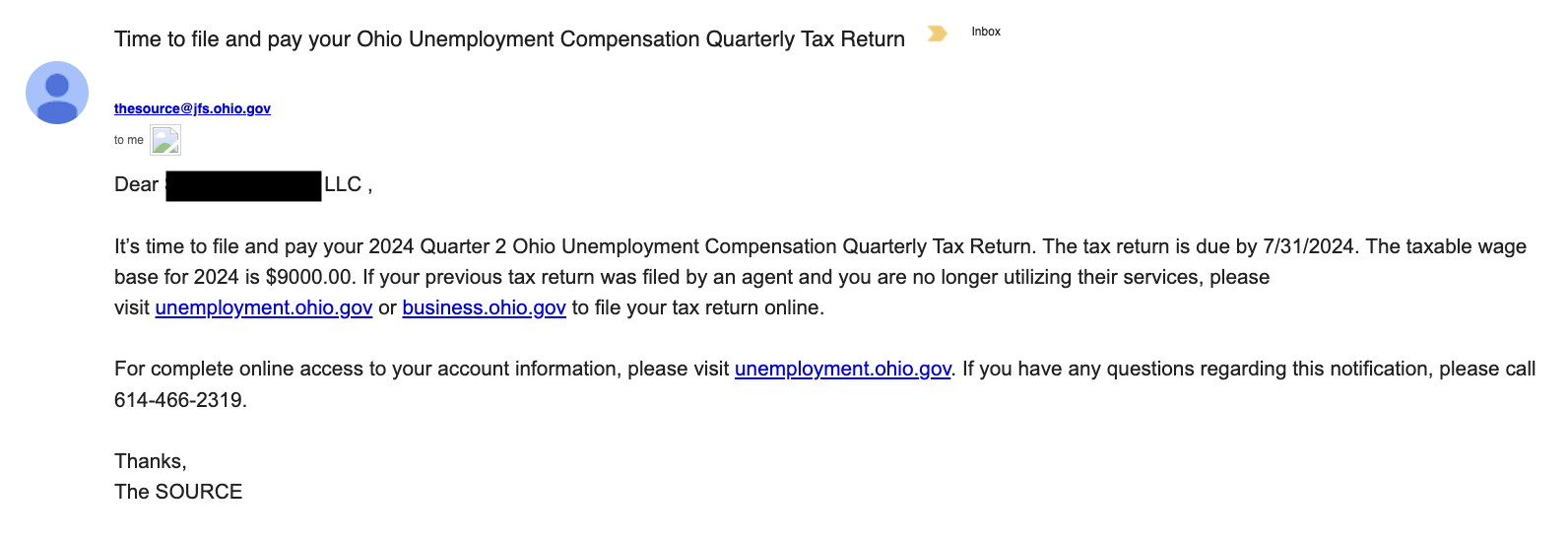 It is common for an agency to send a reminder notice via mail or email when the current quarter is soon coming to an end. These notices do not need to be sent to us for review nor does any action need to be taken on your end. These notices often include a blank filing form as well. As your payroll provider, we handle the upcoming payroll tax filings for you and already have any physical forms required.