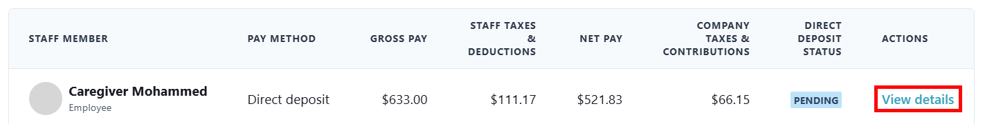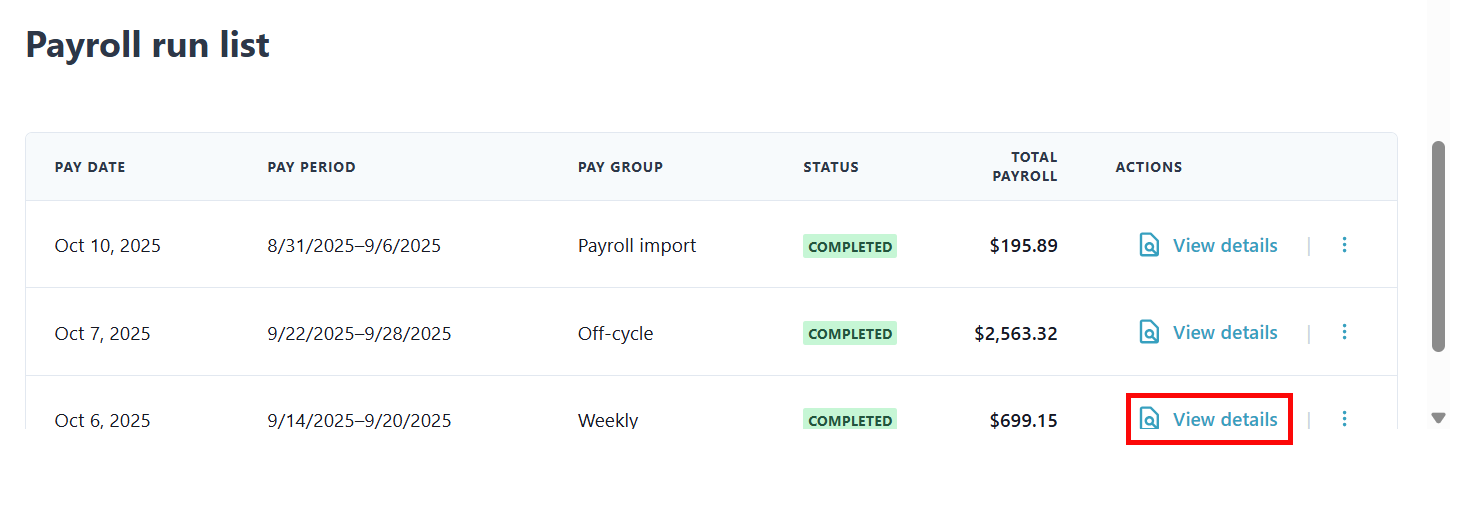 Go to Financials > Generate Payroll > Run Payroll and scroll down to the Payroll run list section. Click on View details for the payroll run you would like to view.