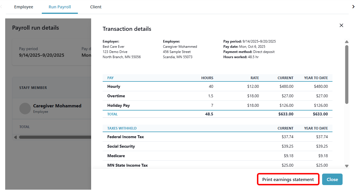 The Transaction details panel opens and displays the worker's pay stub. You can download a PDF copy by clicking the Print earnings statement button.