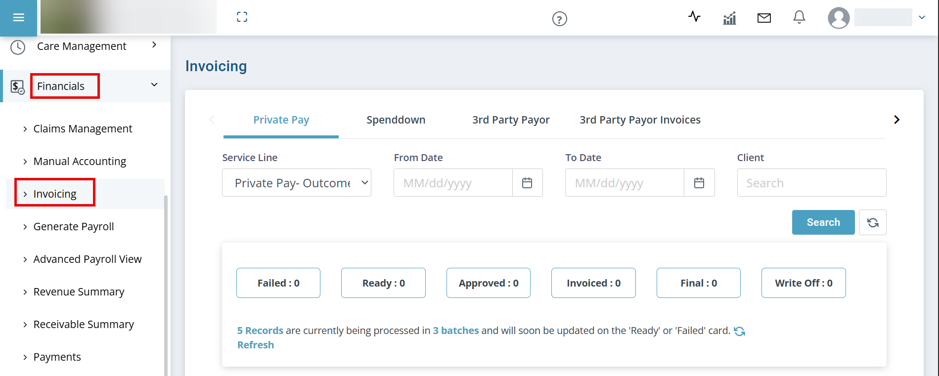 Invoices are generated at the frequency established in the Service Agreement. After time is approved, all records go into Financials > Invoicing > Private Pay, where they are divided into 6 cards: Failed, Ready, Approved, Invoiced, Final, and Write Off.