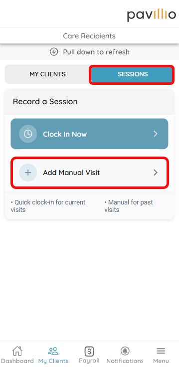 If you were unable to or forgot to clock in for a visit, you can add a Manual Visit via the Pavillio Mobile App.