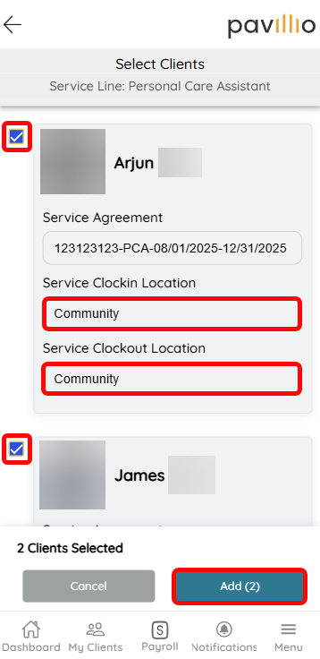 Select the Clients by ticking their checkboxes and select a Service Clockin Location and Service Clockout Location for each one. Tap Add.