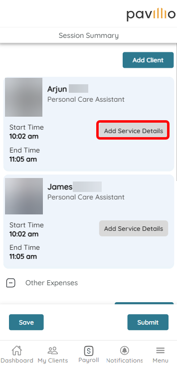 For each Client, tap Add Service Details and complete the following steps: