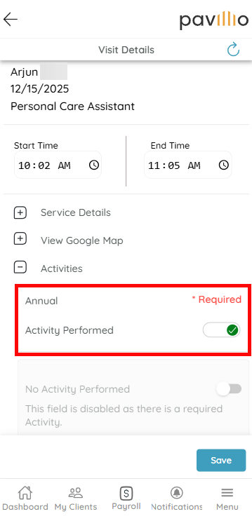 If applicable, toggle on the activities that were performed during the visit by tapping to the right. A green checkmark appears.