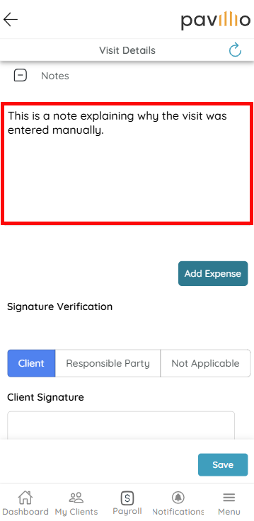 Scroll down to the Notes section and enter a note explaining why the visit needed to be entered manually.
