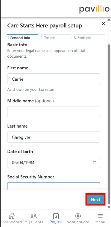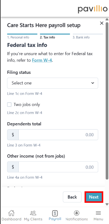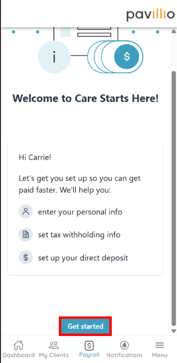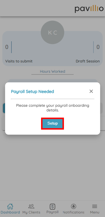Your Agency may need you to enter your payroll and tax information directly in the Pavillio Mobile App. If this is the case, a pop-up notification appears: