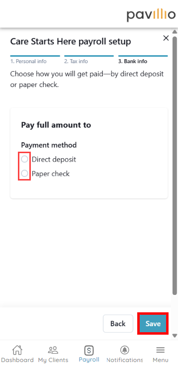 On the following screen, select whether you would like to receive your pay via Direct deposit or Paper check. Selecting Direct deposit prompts you to enter your bank account details.