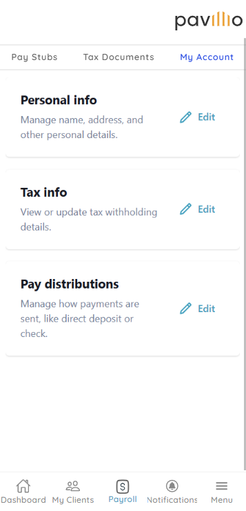 You can update your Personal info, Tax info and Pay distributions at any time from the Payroll screen.